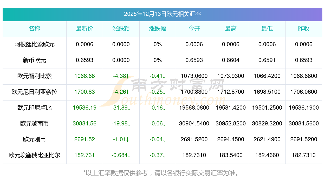 2025年12月13日歐元相關匯率查詢