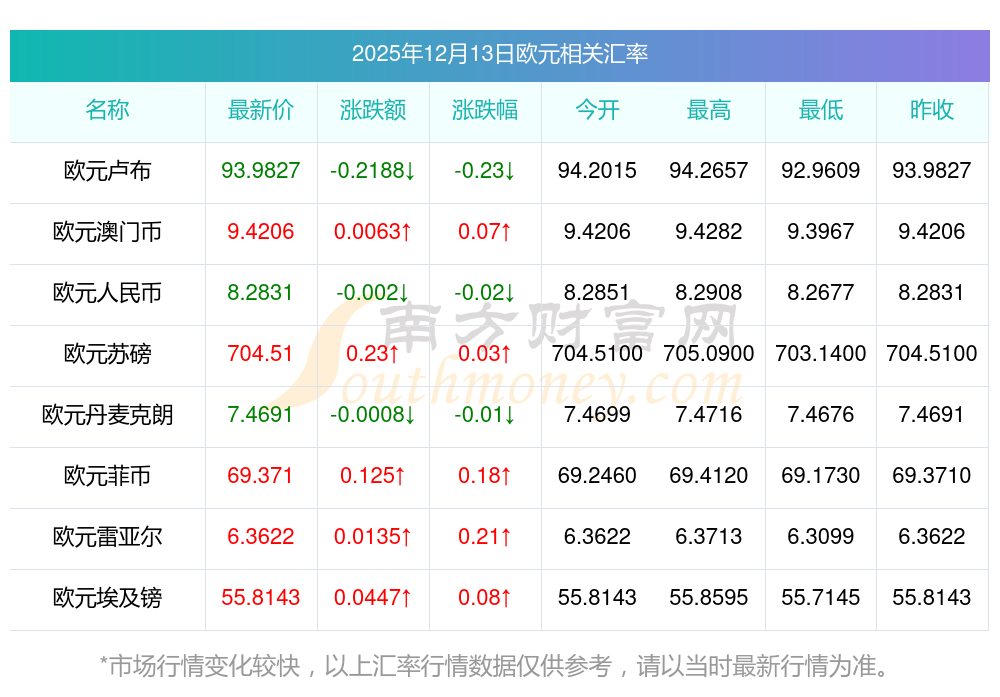 根據(jù)2025年12月13日匯率計算,歐元兌換人民幣匯率最新價8.283100,今開價8.2851,昨收價8.2831,最高價8.2908,最低價8.2677。