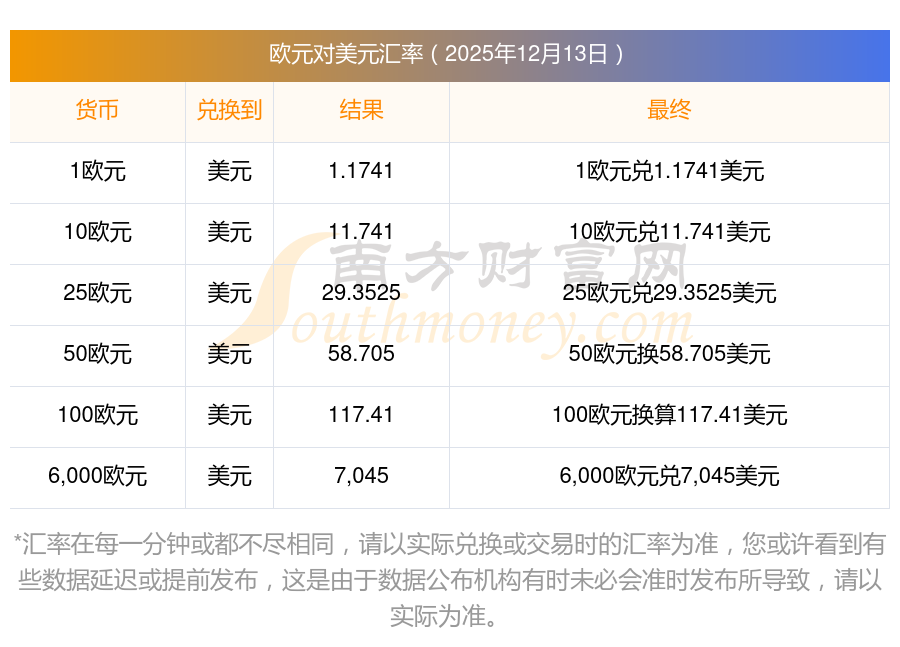 南方財富網(wǎng)為您提供歐元對美元匯率最新價格詳情。