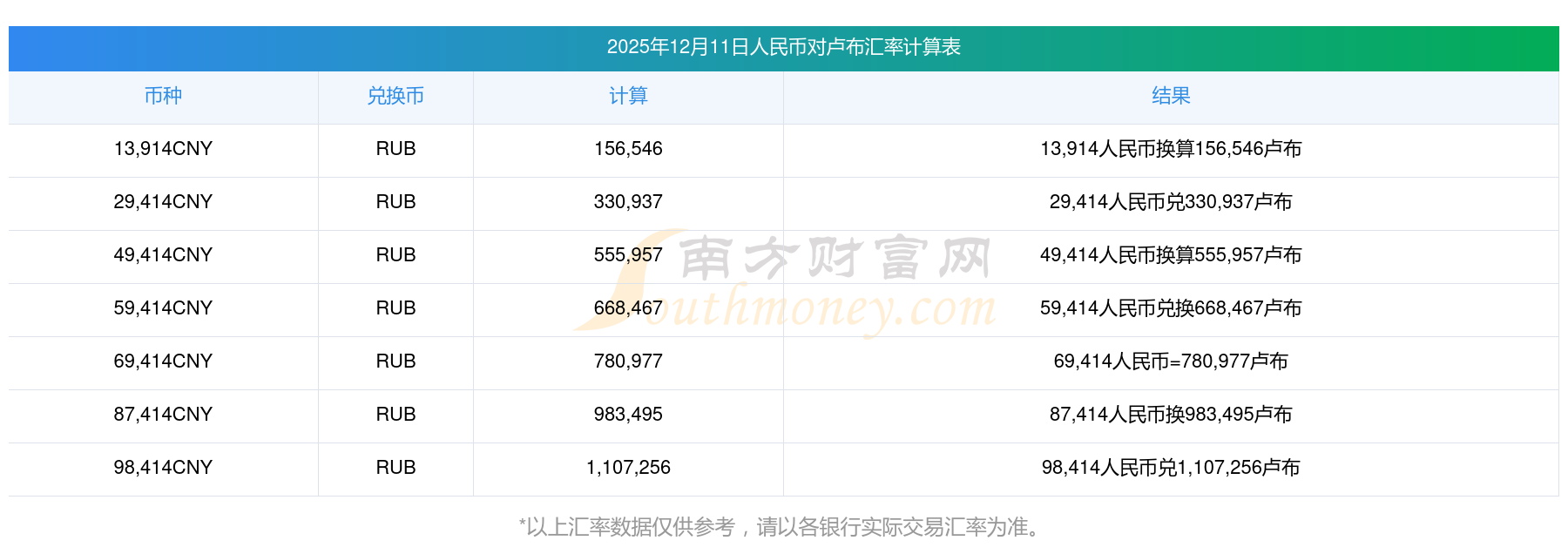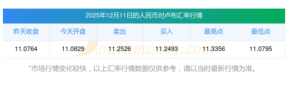 今日匯價查詢:2025年12月11日41人民幣兌盧布匯價一覽
