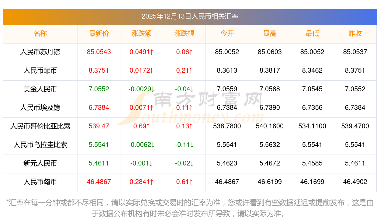 根據(jù)2025年12月13日匯率計算,CNY兌換MYR匯率最新價0.581210:今日開價0.5815,昨日收價0.5812,最高價0.5818,最低價0.5793。