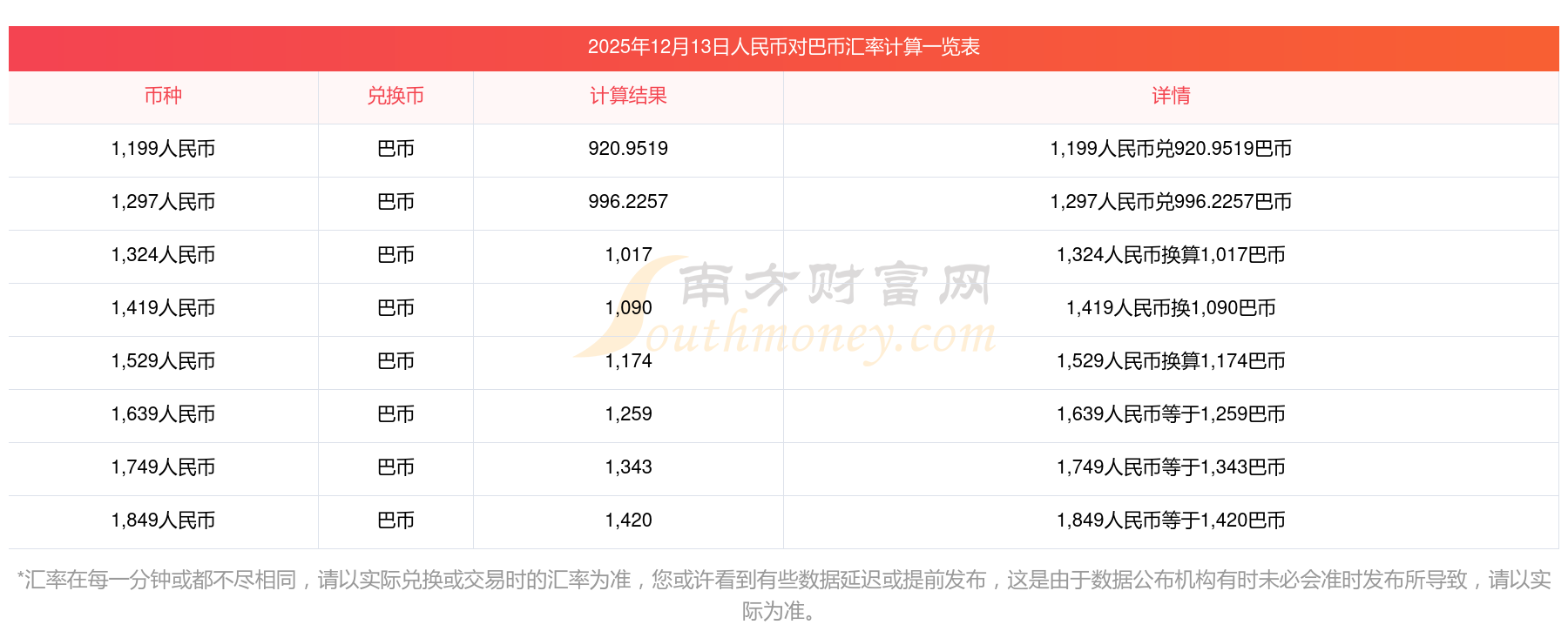 今日人民幣匯價:2025年12月13日113人民幣兌巴幣匯價一覽表