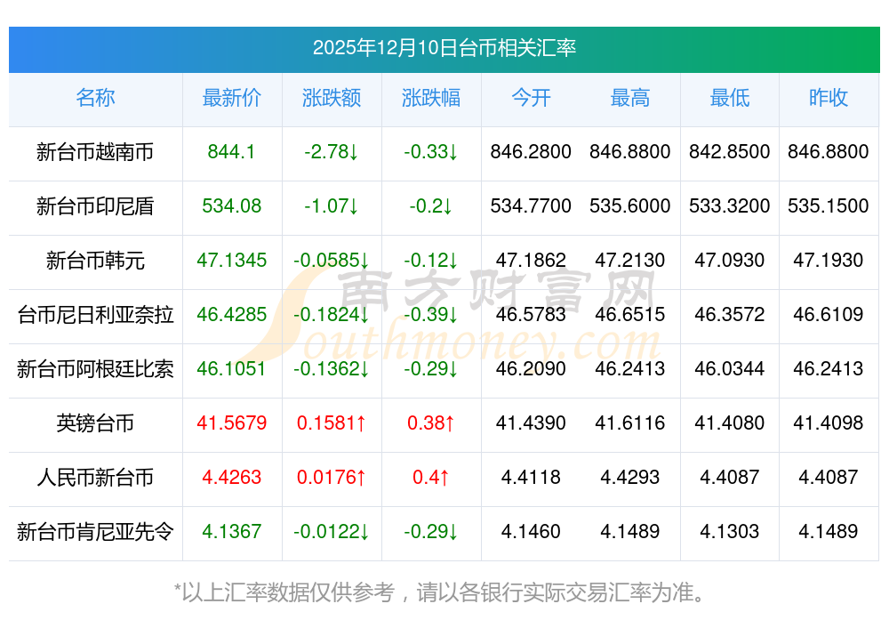 根據今天2025年12月10日匯率計算,TWD兌換BRL匯率最新價0.174100,今開價0.1744,昨收價0.1745,最高價0.1745,最低價0.1737。