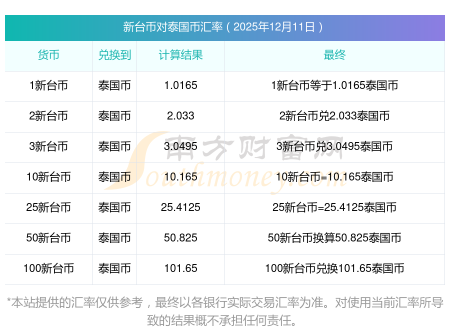南方財富網(wǎng)為您提供新臺幣對泰國幣匯率最新價格詳情。