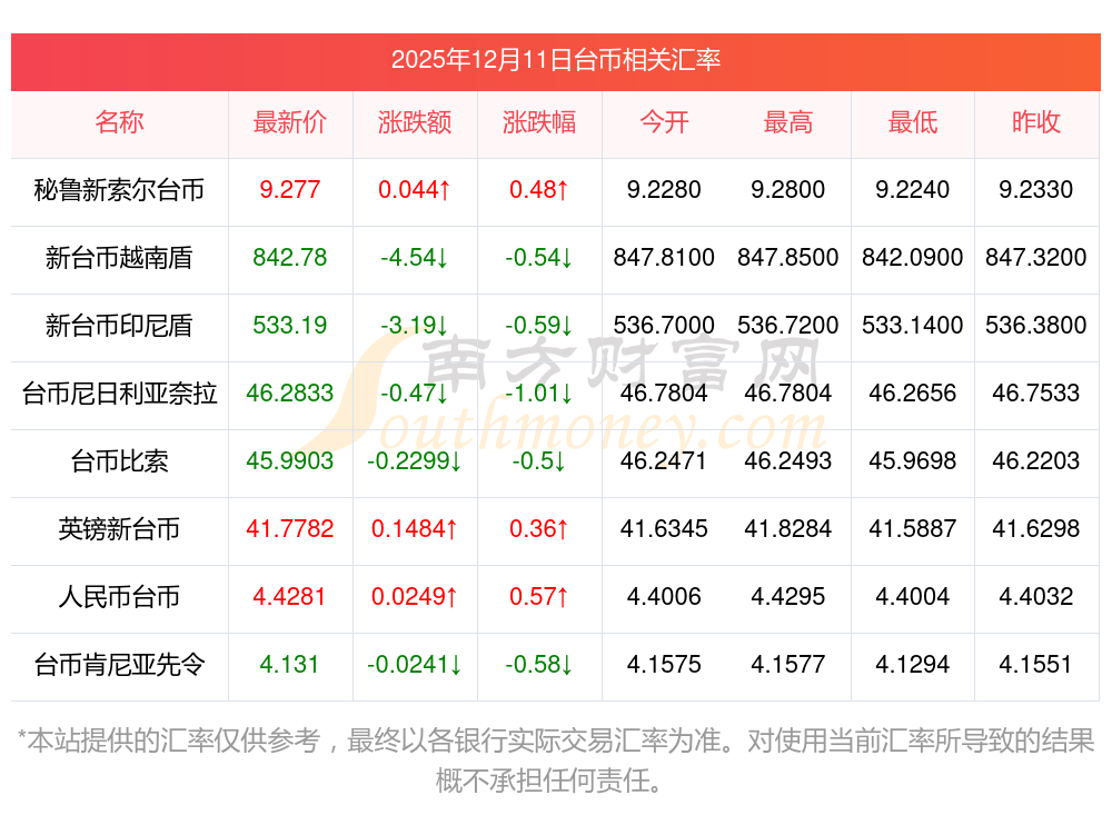 2025年12月11日臺(tái)幣相關(guān)匯率查詢