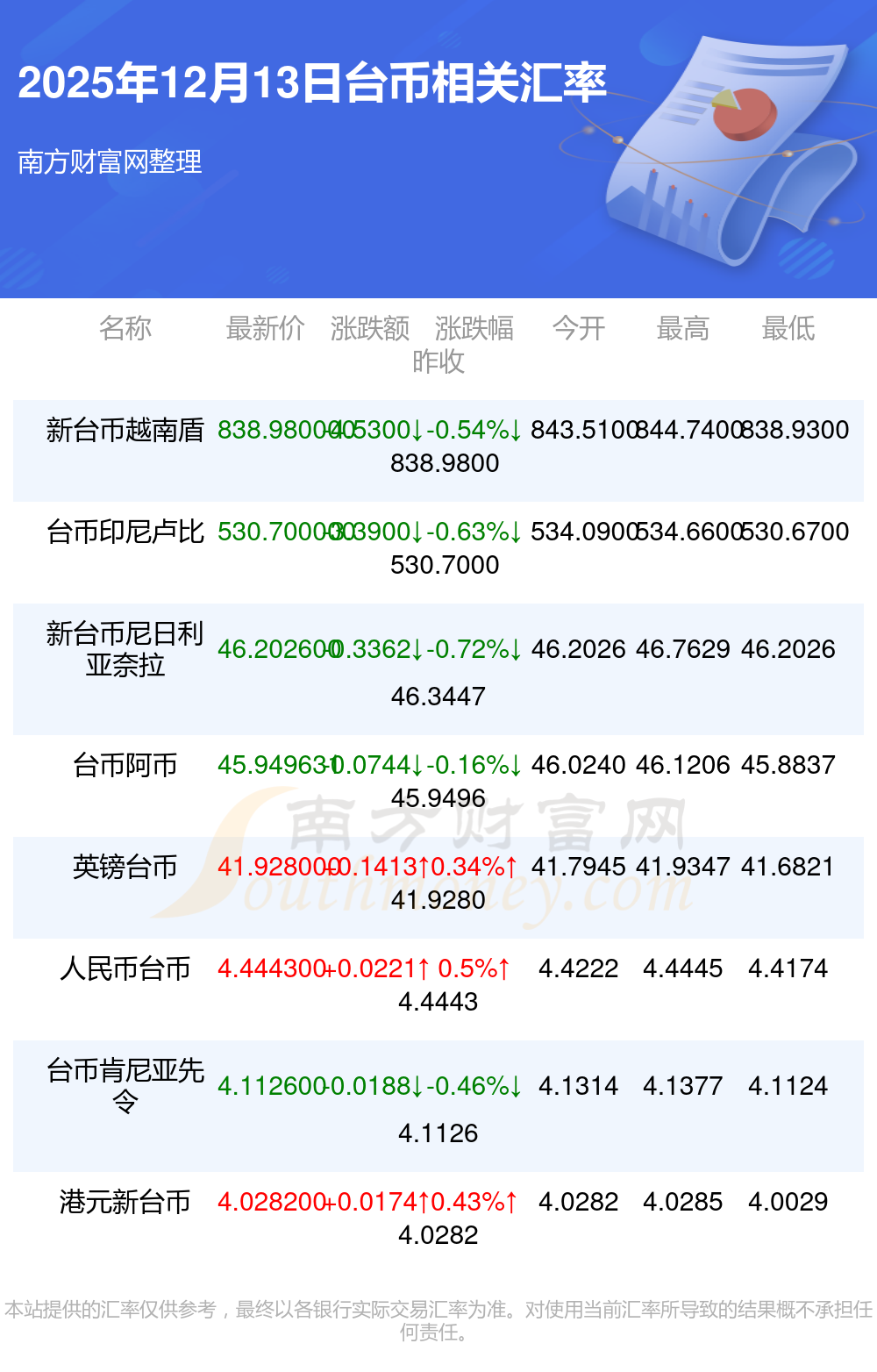 根據(jù)2025年12月13日匯率計算,TWD兌換PHP匯率最新價1.884500:今日開價1.8900,昨日收價1.8845,最高價1.8958,最低價1.8838。