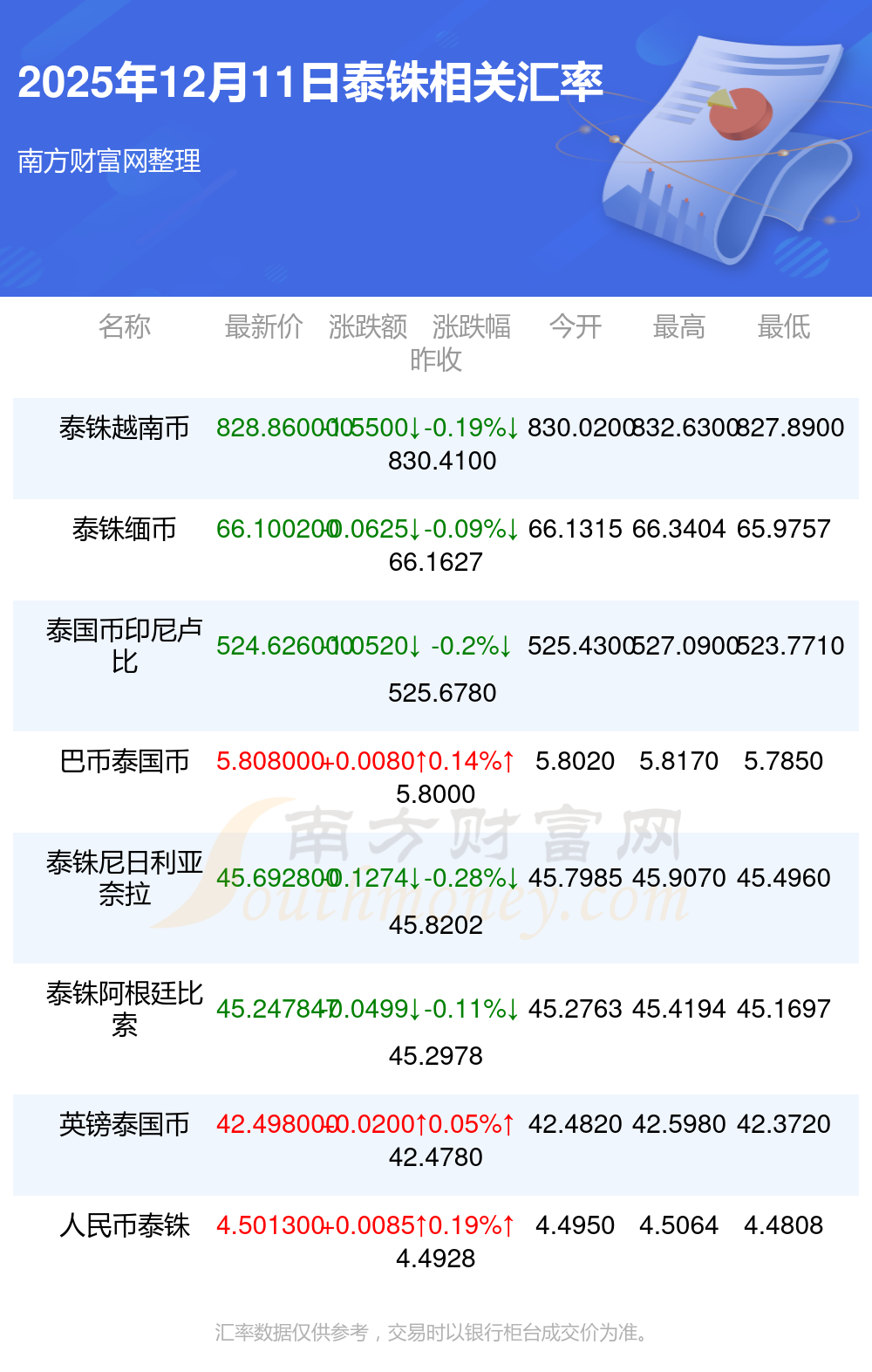 2025年12月11日最新消息,泰銖兌換緬幣最新匯率為66.100200,今開為66.1315,昨收為66.1627,最高為66.3404,最低為65.9757。