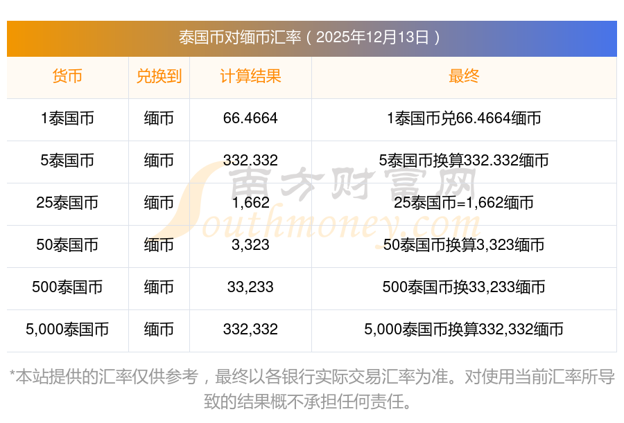 匯率換算:2025年12月13日1泰國幣可以兌換多少緬幣?