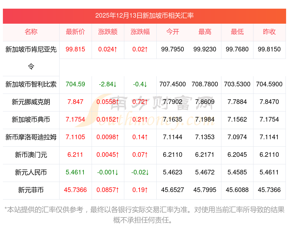 2025年12月13日新加坡幣相關(guān)匯率查詢