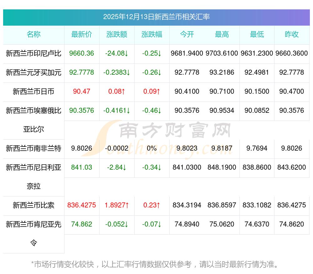 2025年12月13日新西蘭幣相關(guān)匯率查詢