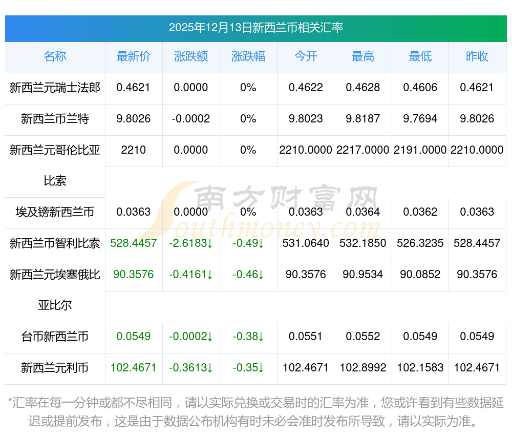 2025年12月13日新西蘭幣相關(guān)匯率查詢