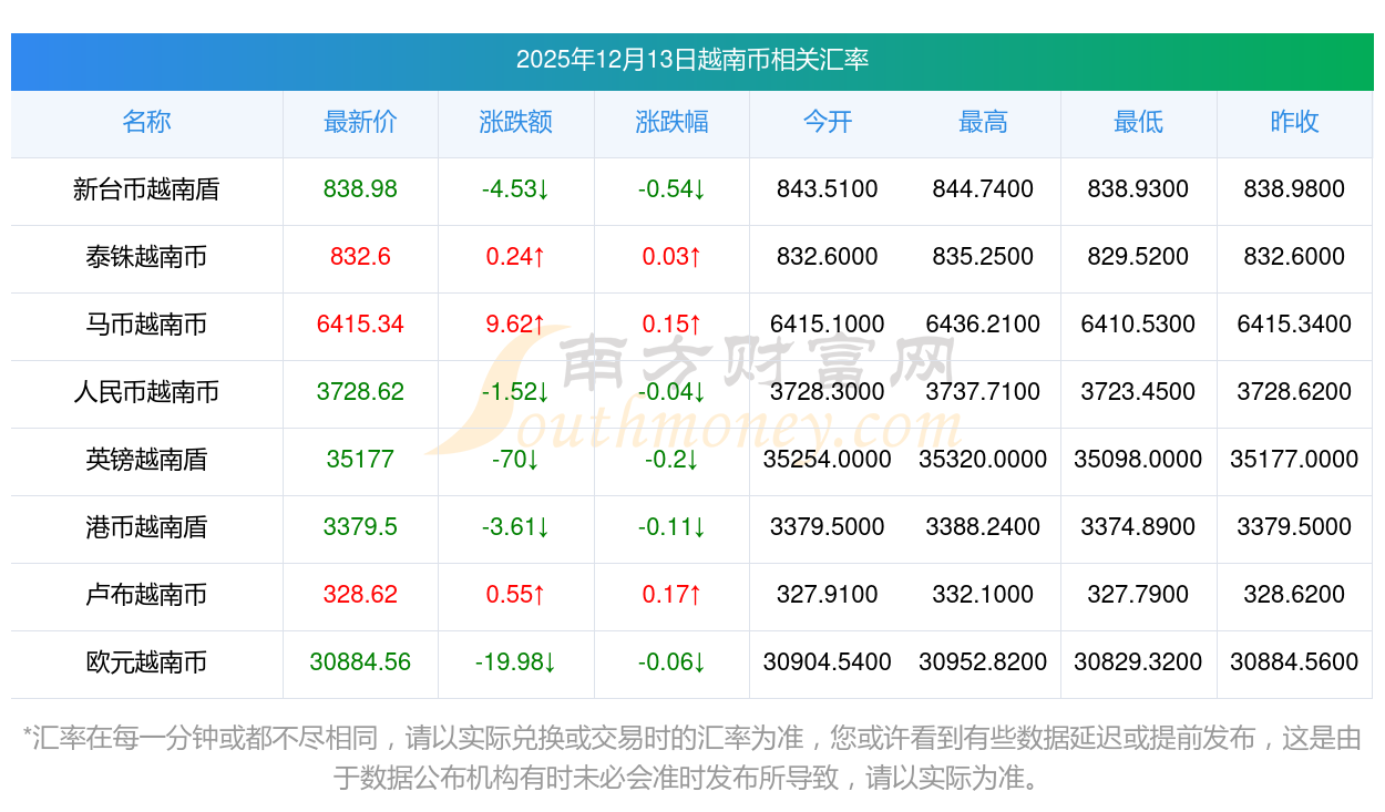 2025年12月13日越南幣相關(guān)匯率查詢