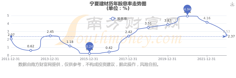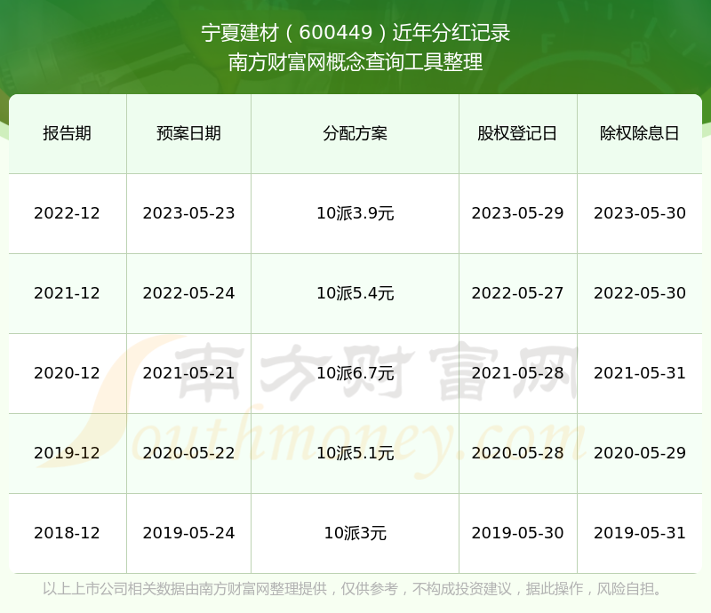 寧夏建材最新一次公布的分紅方案為10派3.9元。本次權(quán)益分派股權(quán)登記日為2023年5月29日,除權(quán)除息日為2023年5月30日,派息日為2023年5月30日。