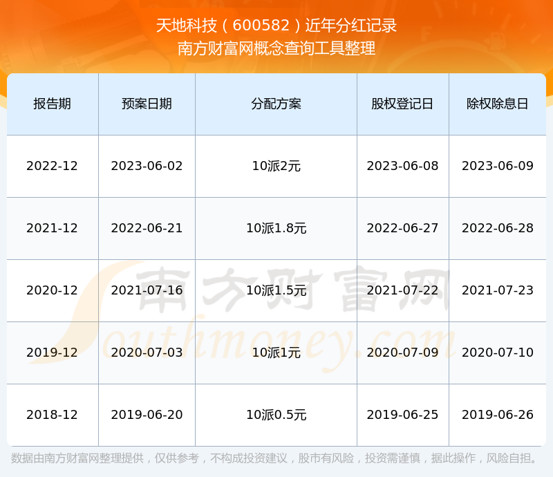 天地科技最新一次公布的分紅方案為10派2元。本次權(quán)益分派股權(quán)登記日為2023年6月8日,除權(quán)除息日為2023年6月9日,派息日為2023年6月9日。