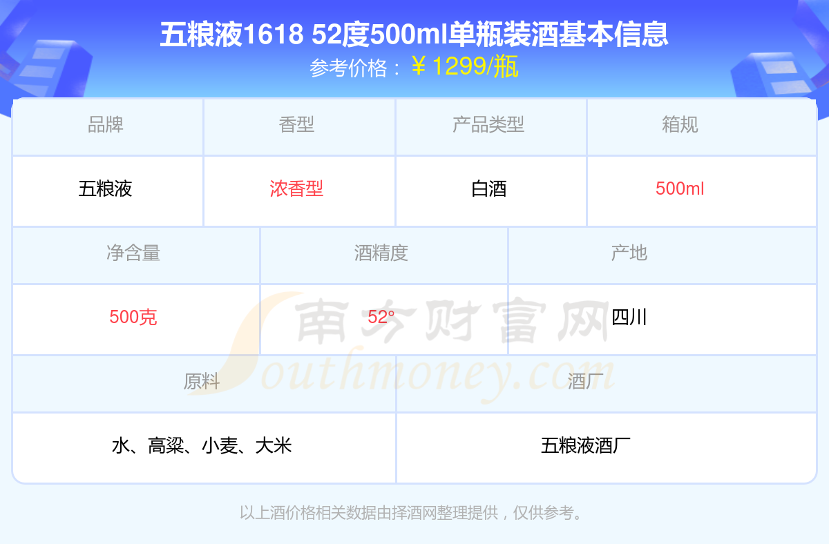 五糧液1618 52度500ml單瓶裝基本信息
