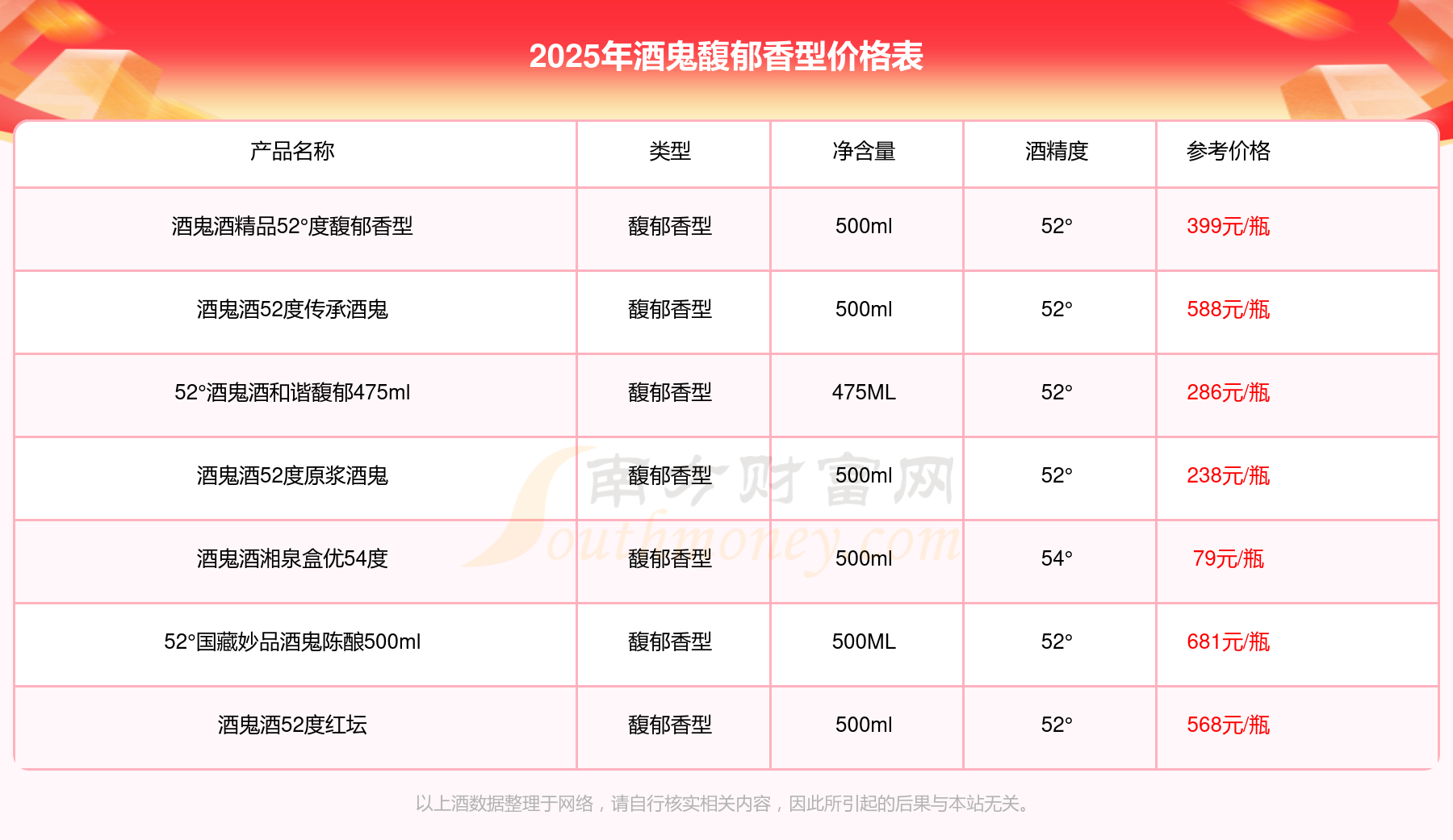 酒鬼馥郁香型酒最新價(jià)格2025:52°國藏妙品酒鬼陳釀500ml參考價(jià)681元/瓶、酒鬼酒52度傳承酒鬼參考價(jià)588元/瓶、酒鬼酒52度紅壇參考價(jià)568元/瓶、酒鬼酒精品52°度馥郁香型參考價(jià)399元/瓶。