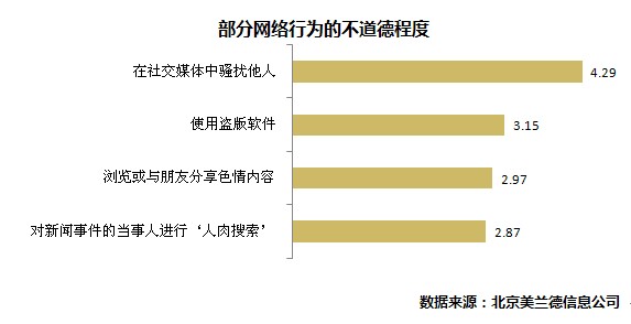 哪些行為在網(wǎng)絡世界中最不道德?調(diào)查顯示,“在社交媒體中騷擾他人”被認為最不道德;其次是“使用盜版軟件”;“瀏覽或與朋友分享色情內(nèi)容”以及“對新聞事件當事人進行人肉搜索”這兩項行為被認為處于“一般”和“輕微不道德”之間。