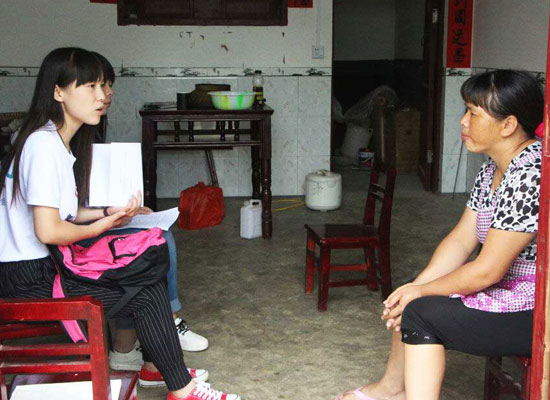 志愿者走訪村民做問(wèn)卷調(diào)查