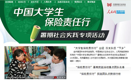 本次活動從全國27個省市100多所高校選拔出100支入圍團(tuán)隊(duì),在暑期分別以支教、環(huán)保、醫(yī)療、調(diào)研等形式服務(wù)鄉(xiāng)村,提高當(dāng)?shù)鼐用癜踩庾R,提升社會對安全教育問題的關(guān)注,同時開展調(diào)研,了解基層保險(xiǎn)保障相關(guān)情況。各團(tuán)隊(duì)實(shí)踐期間在人民網(wǎng)強(qiáng)國社區(qū)活動專區(qū)實(shí)時播報(bào)實(shí)踐進(jìn)程,發(fā)回稿件數(shù)千篇。大學(xué)生們積極走入社會、服務(wù)基層的實(shí)際行動贏得50萬網(wǎng)友為他們“點(diǎn)贊”。