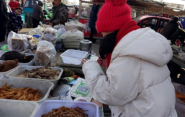 “小伙子,手機(jī)帶了嗎?掃一掃,你就用微信付款吧!”這是攤販大爺?shù)穆曇。江蘇徐州市豐縣的“閆家小旭”對(duì)家鄉(xiāng)集市上菜攤前的二維碼,頗為吃驚,不敢相信。她說:“不到一年時(shí)間,發(fā)現(xiàn)家鄉(xiāng)變化真得好大。中國特色社會(huì)主義‘走進(jìn)新時(shí)代’,農(nóng)村里的樓房越蓋越高,院子也越來越寬敞。鄉(xiāng)間小道變成平整寬闊的水泥路,飛奔的火車也通往家鄉(xiāng)。手機(jī)支付走進(jìn)鄉(xiāng)間集市攤販,西紅柿、茄子、黃瓜、豆角等反季節(jié)蔬菜也成為春節(jié)餐桌上的家常菜。”