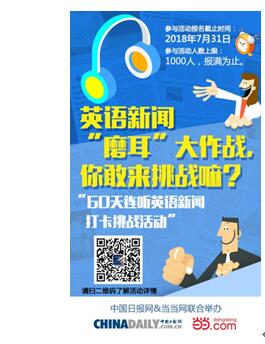 2018這個(gè)夏天,中國日?qǐng)?bào)網(wǎng)攜手當(dāng)當(dāng)網(wǎng)推出首期“60天連聽英語新聞打卡達(dá)人活動(dòng)”,你不僅能通過中國日?qǐng)?bào)網(wǎng)外籍專家的純正英音、美音了解每天世界上的精彩趣聞,還可以考驗(yàn)自己的毅力和自律性。60個(gè)工作日,三個(gè)月的時(shí)間,看似很短,但是你的努力,時(shí)間看得到!跟上我們這60天的步伐,相信您的英語能力會(huì)日益精進(jìn)。