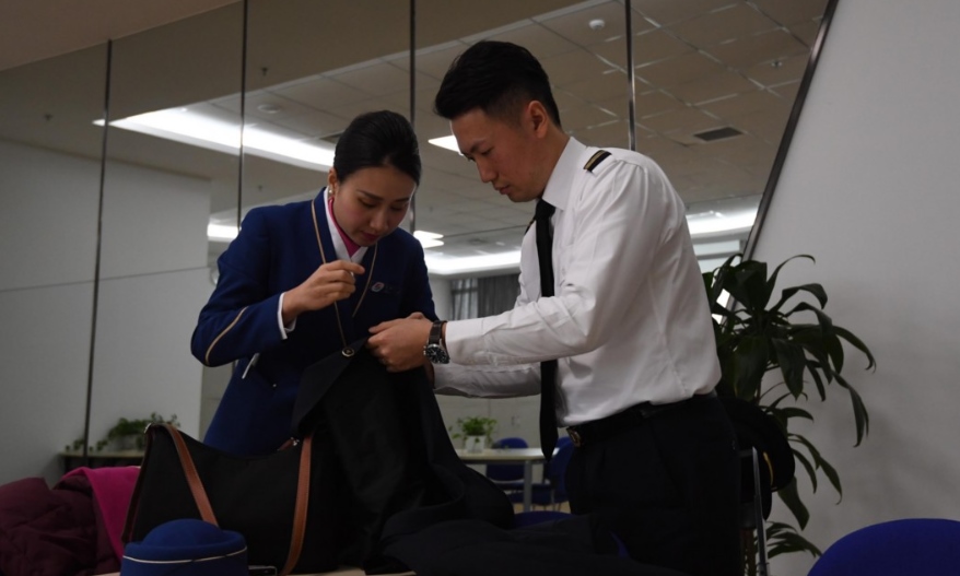 春運期間,劉黎(航空安全員)與妻子練黎(乘務(wù)長)一同堅守崗位。(新華社)