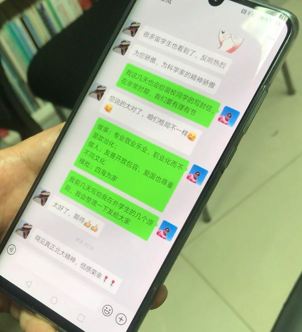(張海霞在師生聯(lián)絡(luò)群中,發(fā)表了一段話:做事:專業(yè)敬業(yè)樂業(yè),職業(yè)化而不是政治化;做人:友善開放包容,愛國也尊重不同文化;橫批:四海為家 崔澤昊/攝)