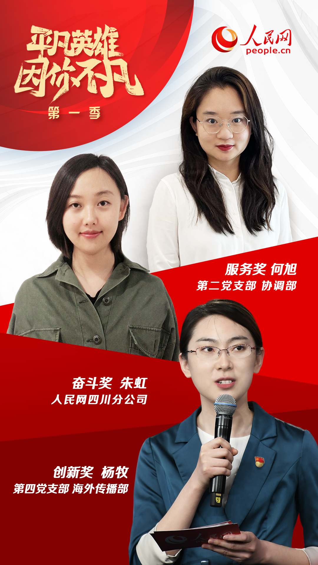 經(jīng)過激烈比拼,第二黨支部何旭(協(xié)調(diào)部)、第四黨支部楊牧(海外傳播部)、四川分公司朱虹三位同志最終分獲“平凡英雄”服務(wù)獎、創(chuàng)新獎和奮斗獎。同時,第七黨支部董曉偉(網(wǎng)絡(luò)評論部)、第十一黨支部厲姣(紀(jì)檢監(jiān)察室)、第十三黨支部鄭瀟瀟(移動內(nèi)容部)、第二十一黨支部張利娟(人民視聽科技有限公司)、安徽分公司李希、山西分公司馬瑩等六位同志獲得“平凡英雄”入圍獎。