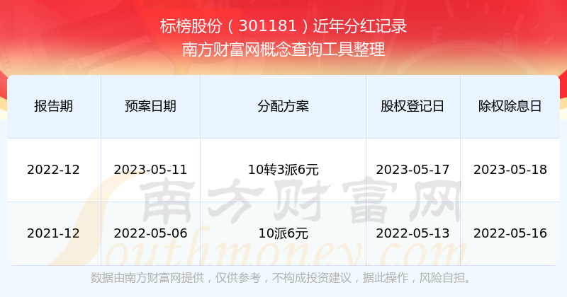 標榜股份最新一次公布的分紅方案為10轉(zhuǎn)3派6元。本次權益分派股權登記日為2023年5月17日,除權除息日為2023年5月18日,派息日為2023年5月18日。