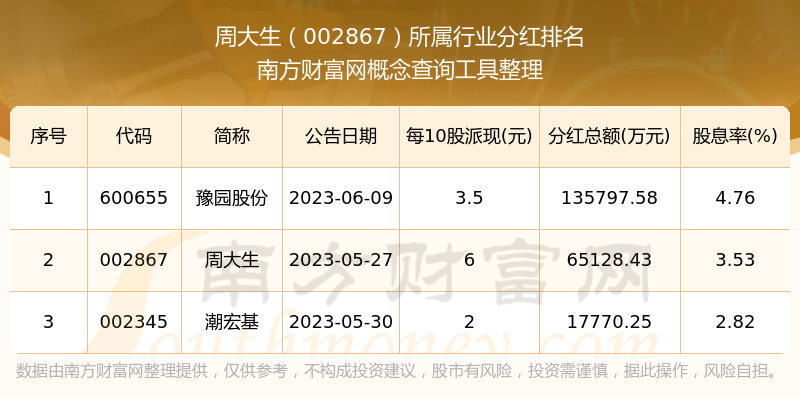 按照南方財(cái)富網(wǎng)趨勢選股系統(tǒng)統(tǒng)計(jì),周大生所屬行業(yè)為珠寶首飾行業(yè),珠寶首飾行業(yè)分紅排名情況如下表: