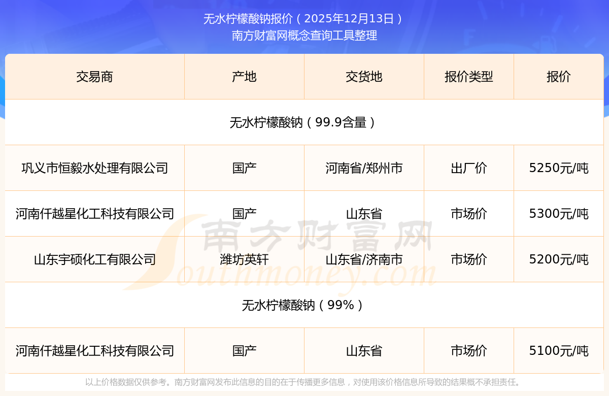 2025年12月13日,河南仟越星化工科技有限公司無水檸檬酸鈉(99%),國產(chǎn),交易地點為山東省,報價為5100.00元/噸。