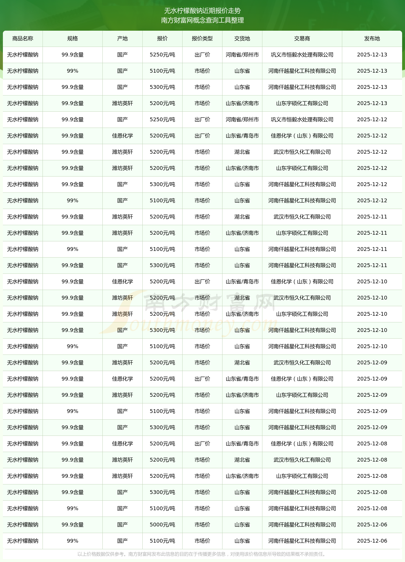 2025年12月13日,河南仟越星化工科技有限公司無水檸檬酸鈉(99.9含量),國產(chǎn),交易地點為山東省,報價為5300.00元/噸。