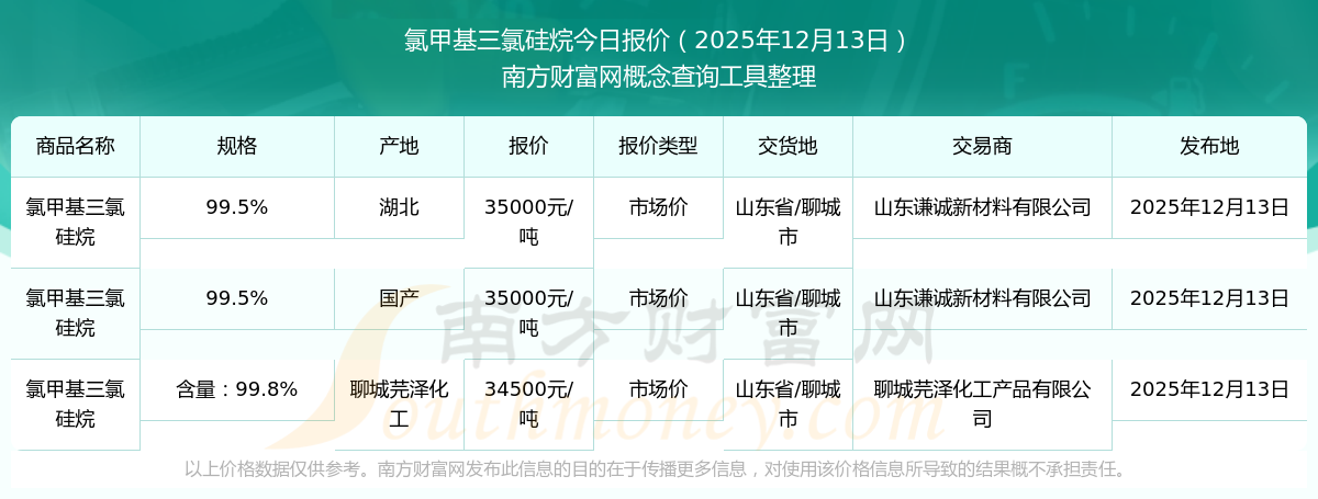 2025年12月13日,山東謙誠新材料有限公司氯甲基三氯硅烷(99.5%),湖北,交易地點為山東省/聊城市,市場價報價為35000.00元/噸。