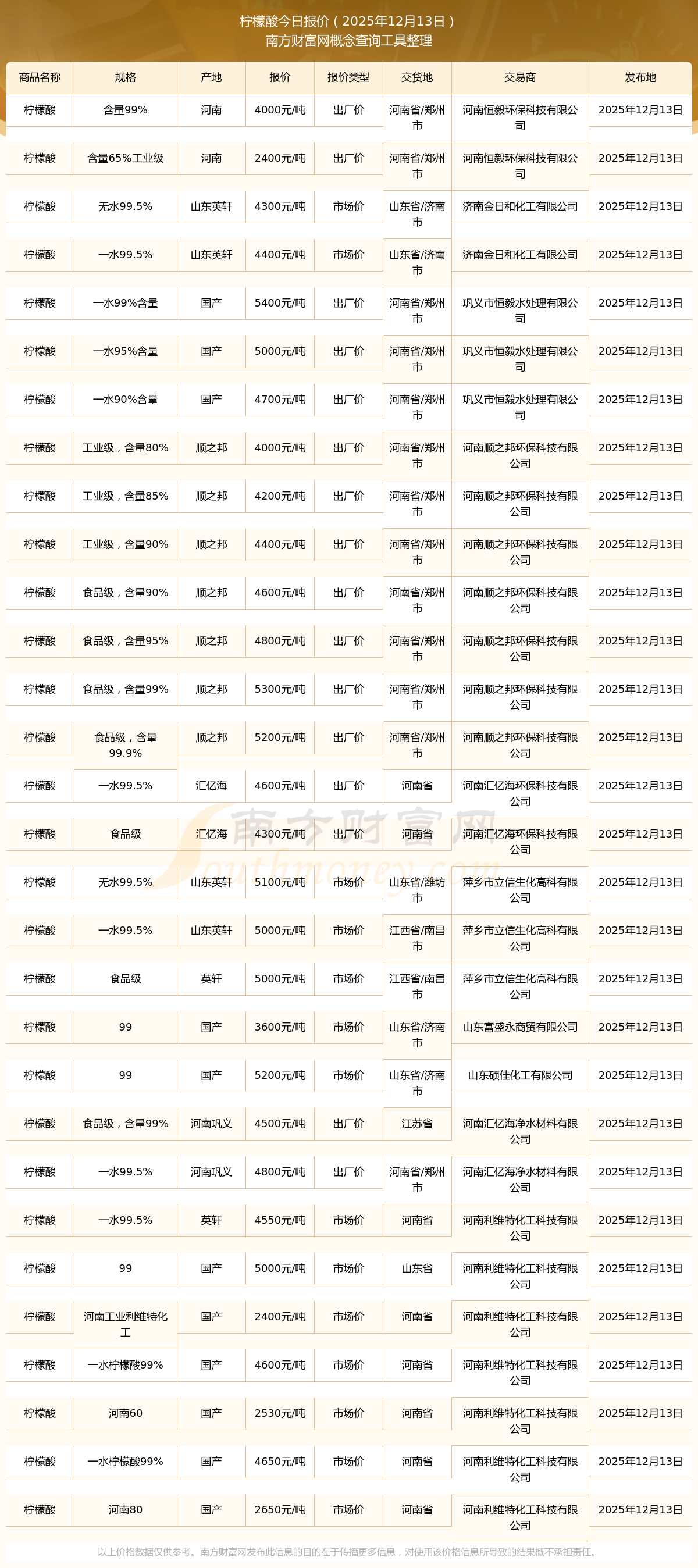 2025年12月13日,濟(jì)南金日和化工有限公司檸檬酸(無(wú)水99.5%),山東英軒,交易地點(diǎn)為山東省/濟(jì)南市,報(bào)價(jià)為4300.00元/噸。