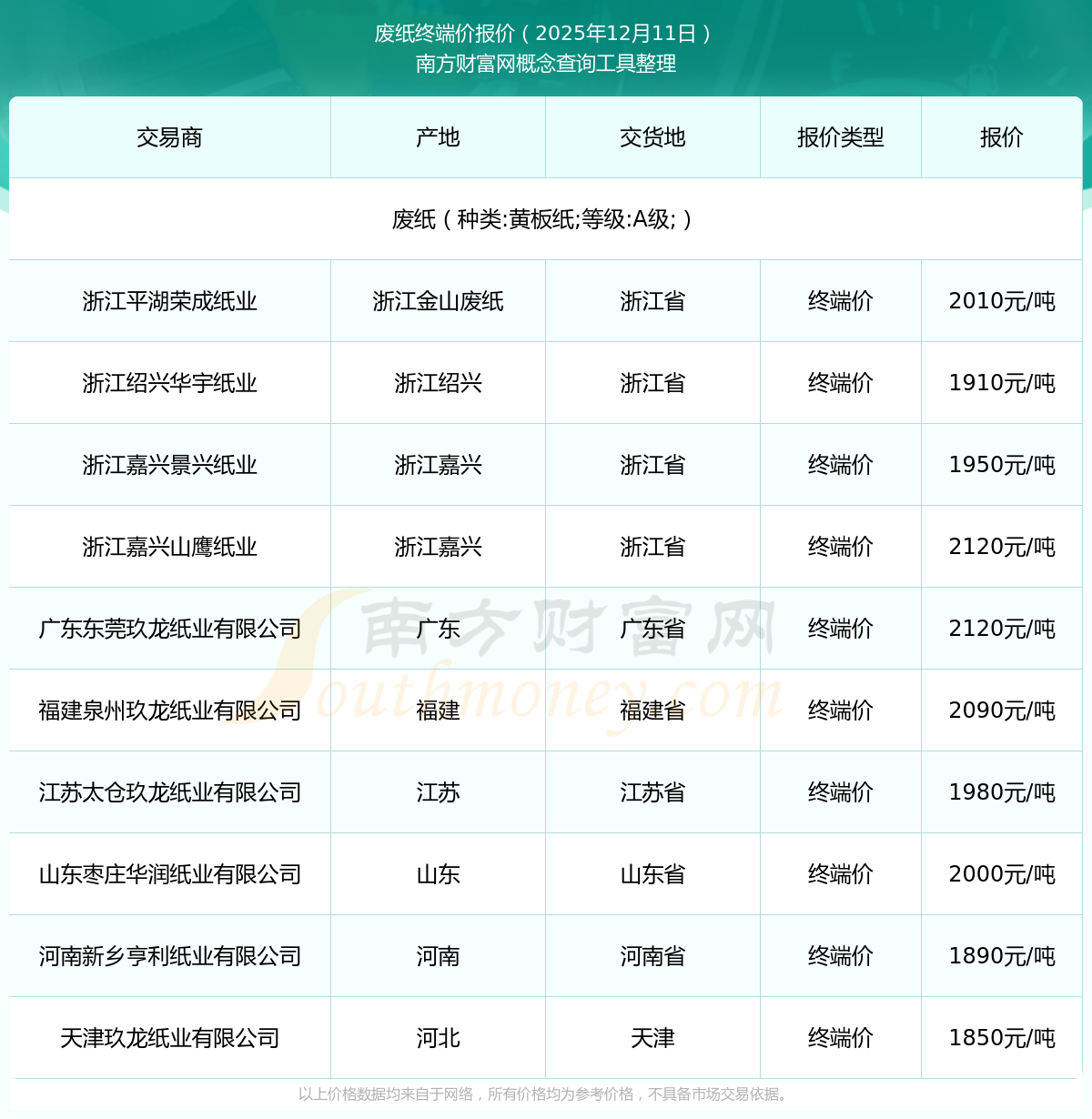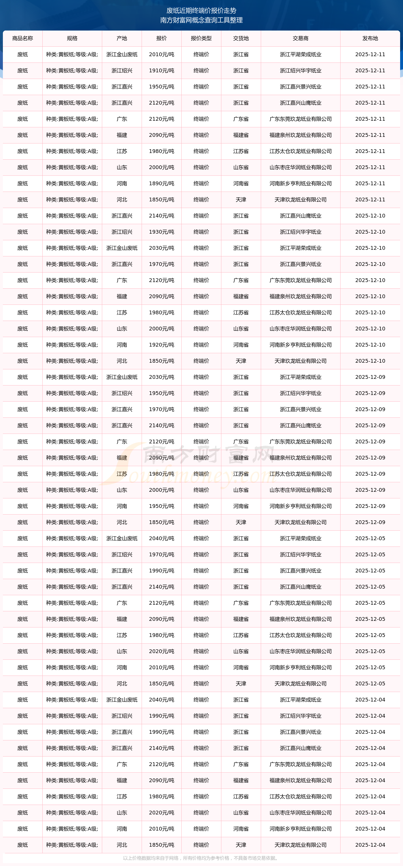 2025年12月11日,浙江平湖榮成紙業(yè)廢紙(種類:黃板紙;等級:A級;),浙江金山廢紙,交易地點為浙江省,終端價報價為2010.00元/噸。