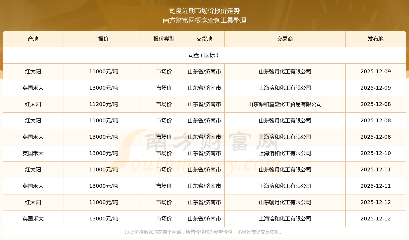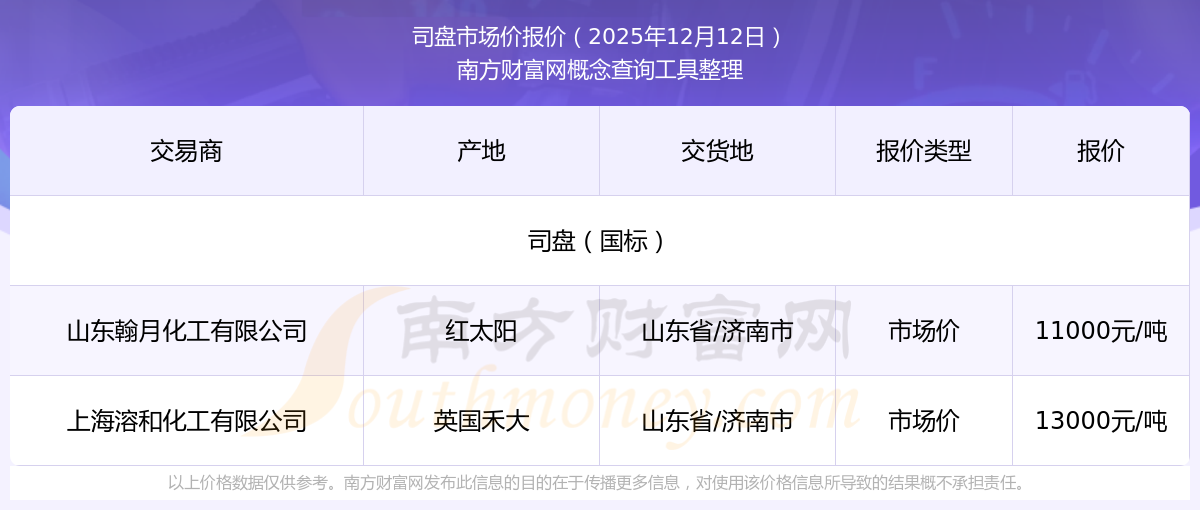 2025年12月12日,司盤(國標(biāo))市場(chǎng)價(jià)價(jià)格為11000.00元/噸,報(bào)價(jià)人:山東翰月化工有限公司,交易地點(diǎn)為山東省/濟(jì)南市。