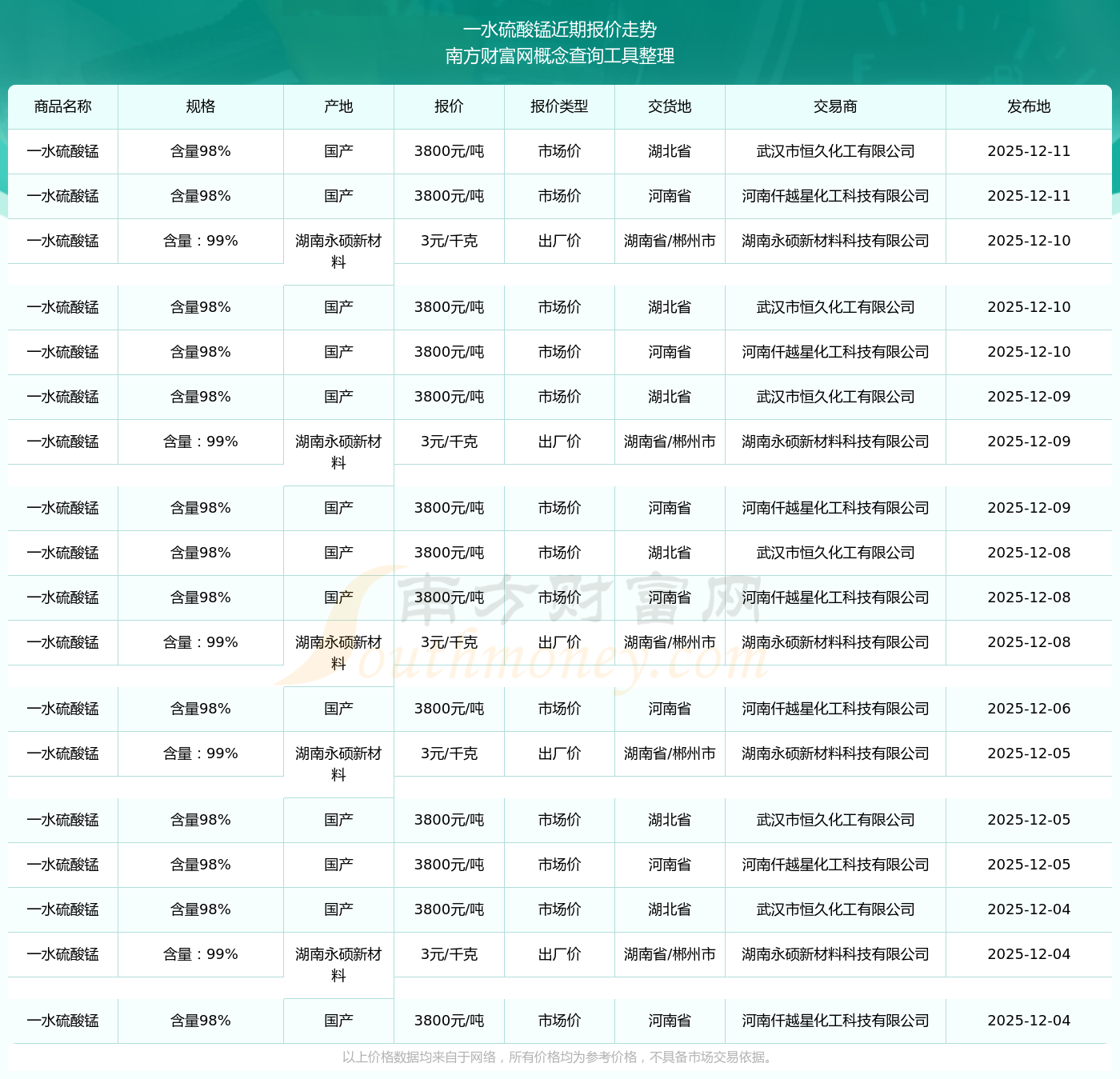 2025年12月11日,一水硫酸錳(含量98%)價格為3800.00元/噸,報價人:河南仟越星化工科技有限公司,交易地點為河南省。