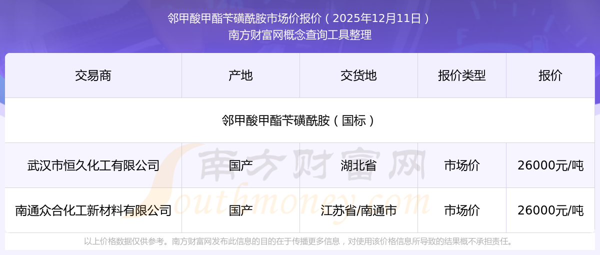 2025年12月11日,南通眾合化工新材料有限公司鄰甲酸甲酯芐磺酰胺(國標),國產,交易地點為江蘇省/南通市,市場價報價為26000.00元/噸。