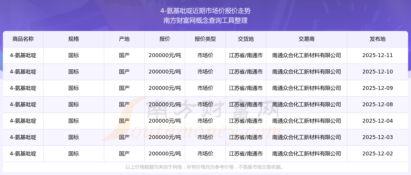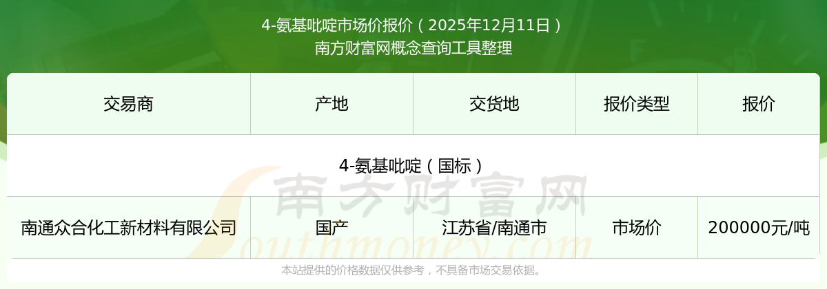 2025年12月11日,南通眾合化工新材料有限公司4-氨基吡啶(國標(biāo)),國產(chǎn),交易地點(diǎn)為江蘇省/南通市,市場價(jià)報(bào)價(jià)為200000.00元/噸。