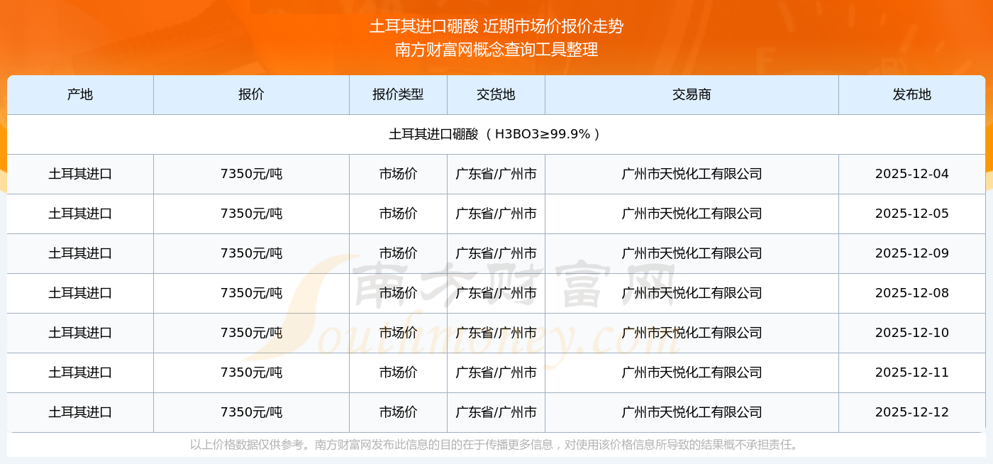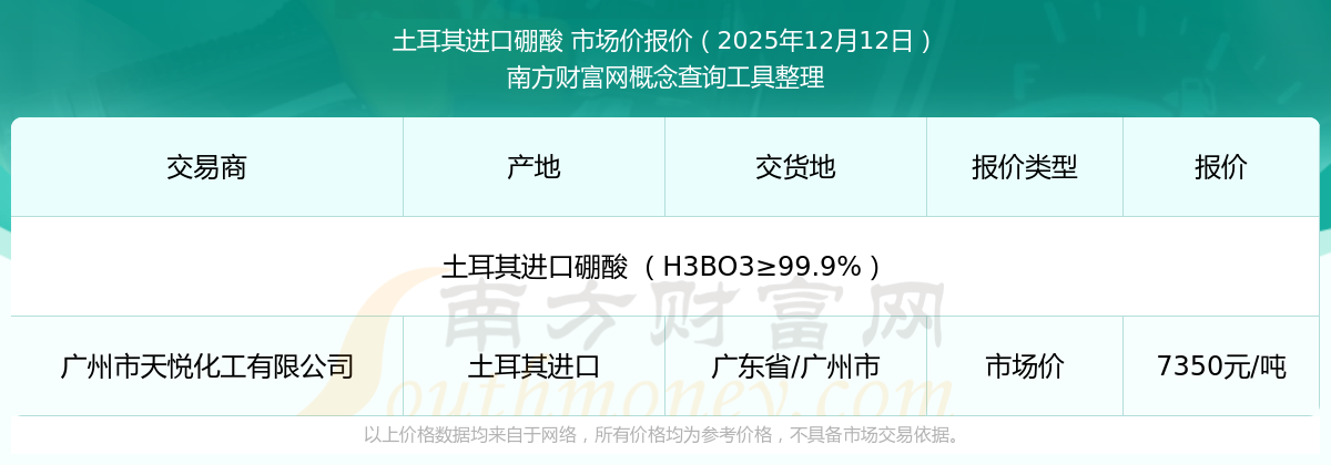 2025年12月12日,土耳其進(jìn)口硼酸 (H3BO3≥99.9%)市場價(jià)價(jià)格為7350.00元/噸,報(bào)價(jià)人:廣州市天悅化工有限公司,交易地點(diǎn)為廣東省/廣州市。