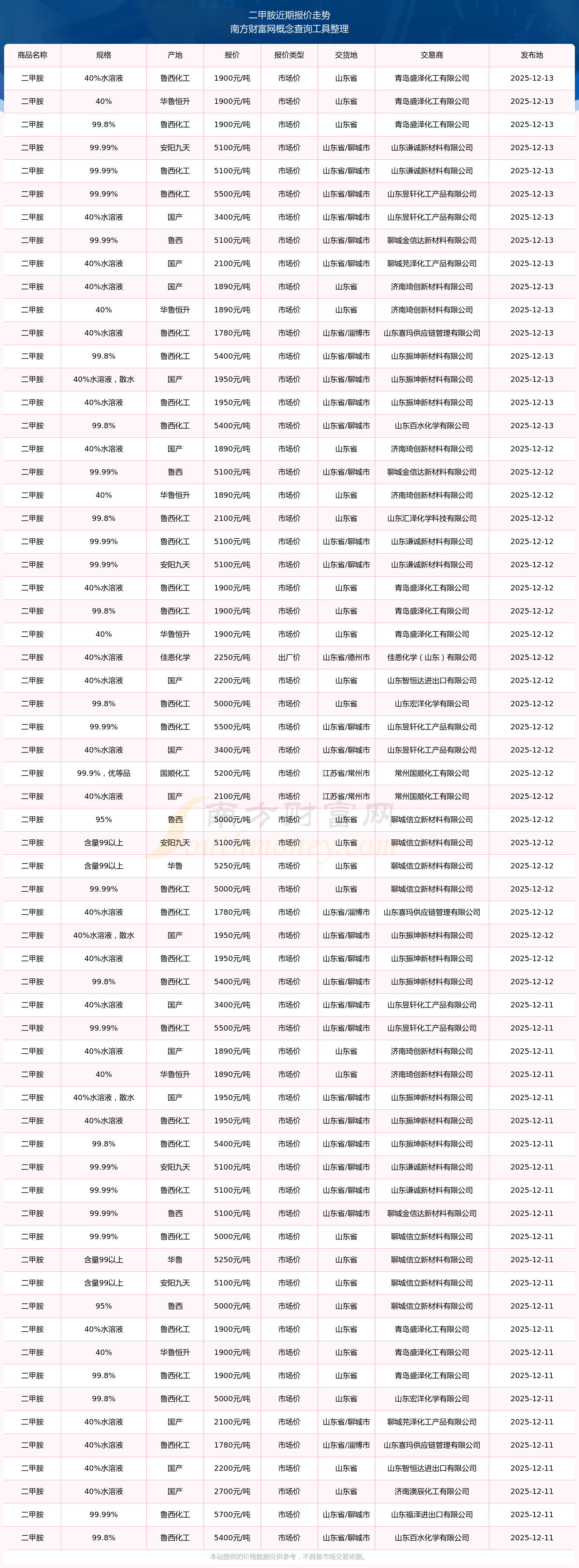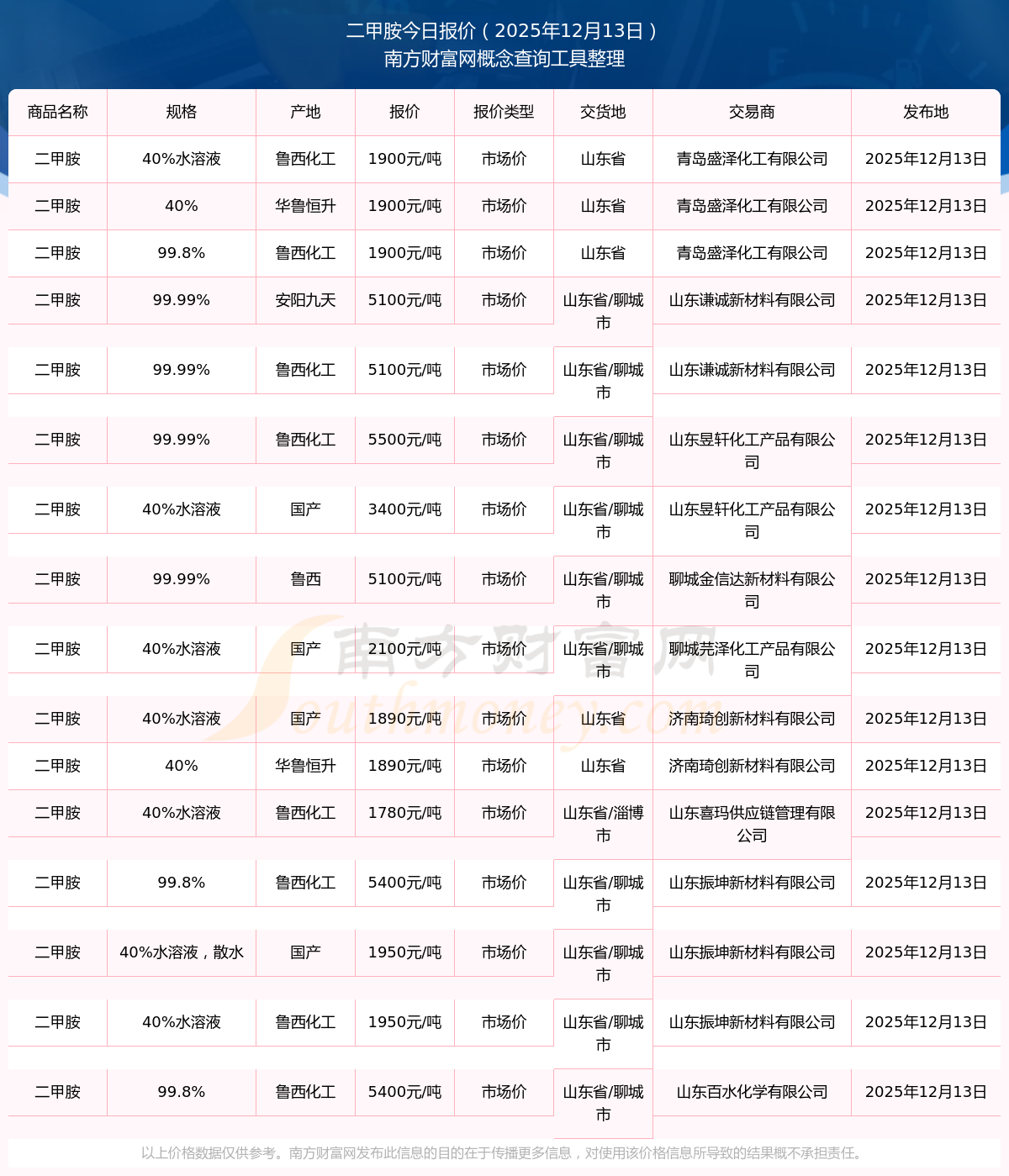 2025年12月13日,青島盛澤化工有限公司二甲胺(40%水溶液),魯西化工,交易地點為山東省,報價為1900.00元/噸。