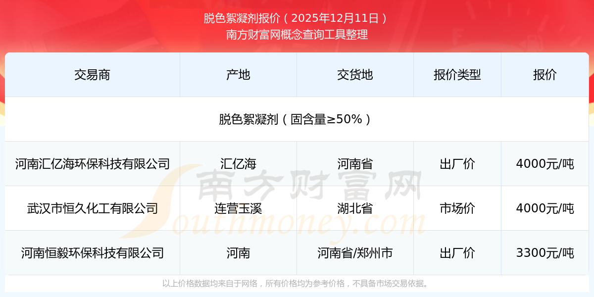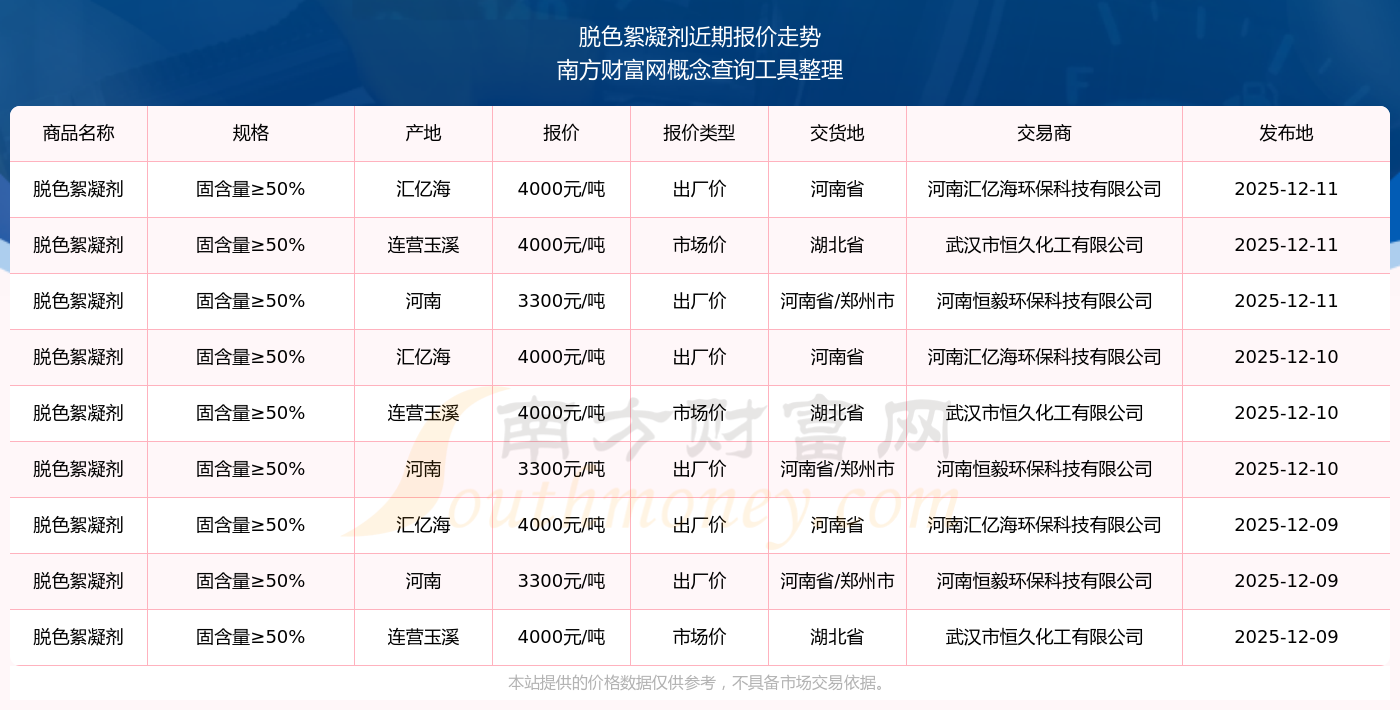 2025年12月11日,河南匯億海環(huán)保科技有限公司脫色絮凝劑(固含量≥50%),匯億海,交易地點為河南省,報價為4000.00元/噸。