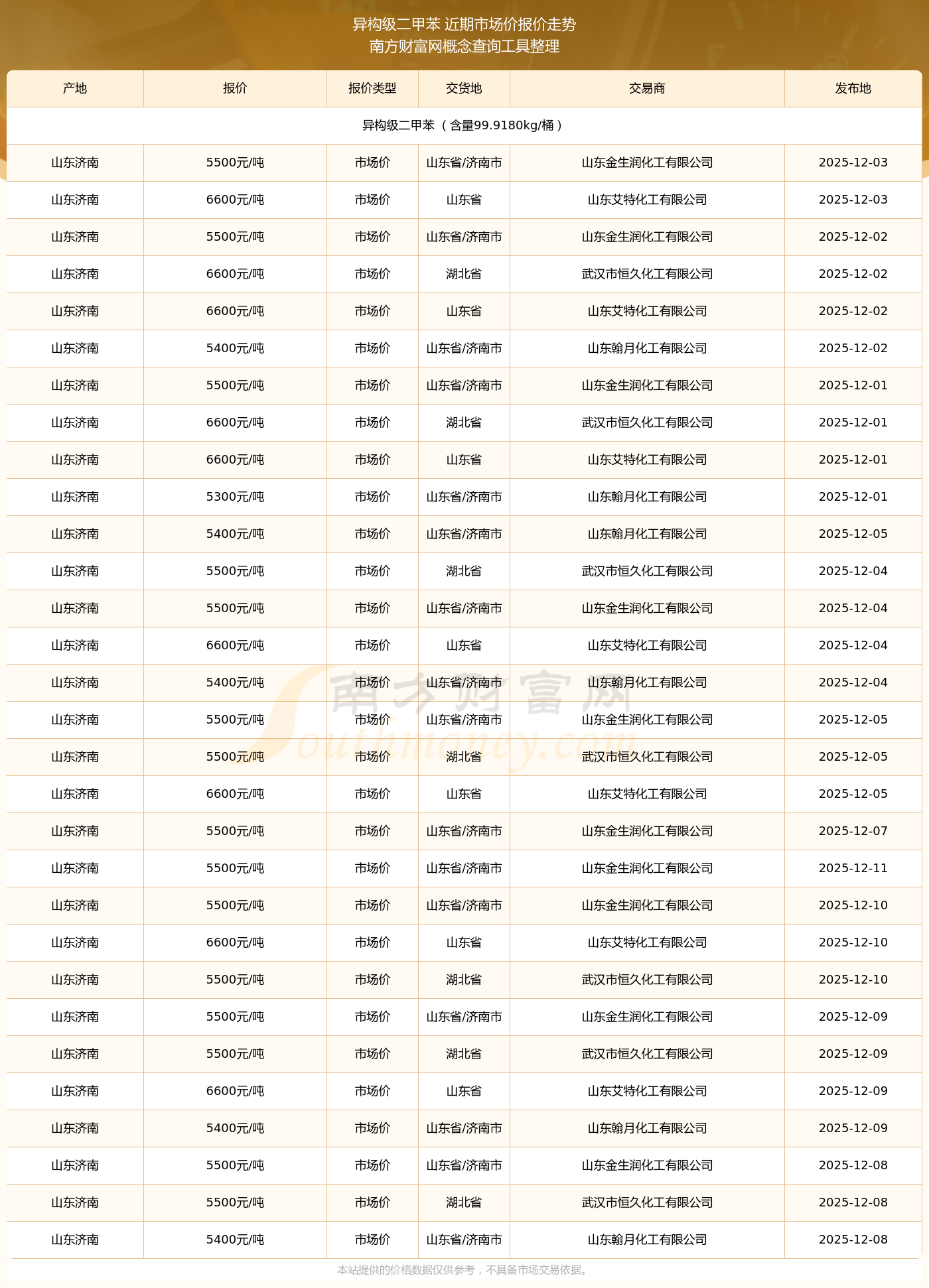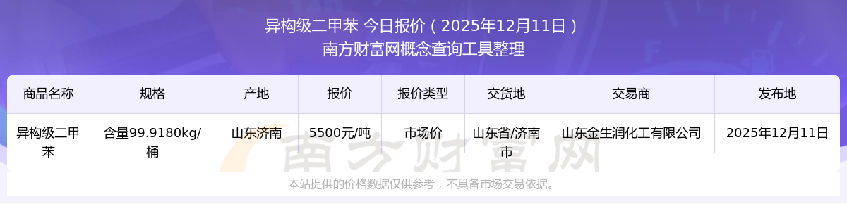 2025年12月11日,異構(gòu)級(jí)二甲苯 (含量99.9180kg/桶)市場(chǎng)價(jià)價(jià)格為5500.00元/噸,報(bào)價(jià)人:山東金生潤(rùn)化工有限公司,交易地點(diǎn)為山東省/濟(jì)南市。
