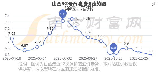 12月13日,山西92號汽油的價(jià)格是6.8元每升,本次的調(diào)整時(shí)間為12月9日,對比上次的調(diào)整下跌了0.04元,下跌0.585%,12月22日24時(shí)為下一輪油價(jià)調(diào)整時(shí)間,還有9.13天。