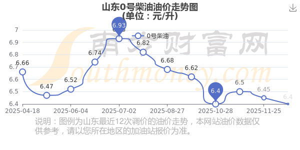 12月13日,山東0號柴油的價格是6.4元每升,本次的調(diào)整時間為12月9日,對比上次的調(diào)整降了0.05元,降0.775%,下次調(diào)整時間為12月22日24時,還有9.11天。