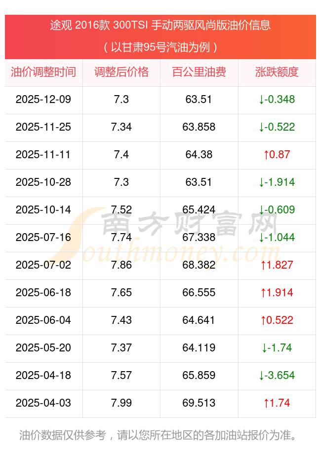 根據(jù)12月9日95號汽油最新調整價格7.3元/升來計算(以甘肅為例),該車型每百公里的平均油費是63.51元,上一輪11月25日調整價格7.34元每升來計算,每百公里的平均油費是63.858元,對比上一輪少花0.348元,下一輪的油價調整時間是12月22日24時。