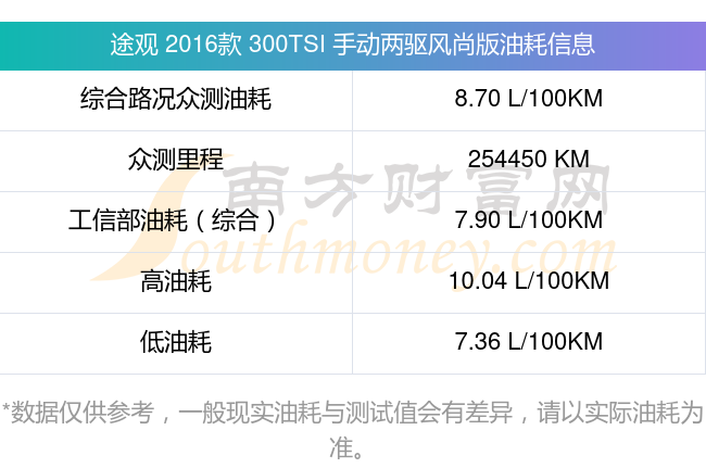 根據(jù)多位車主實測得出數(shù)據(jù),該車型低油耗為7.36升/百公里,高油耗為10.04升/百公里,綜合路況眾測油耗為8.70升/百公里,工信部綜合油耗為7.90升/百公里。