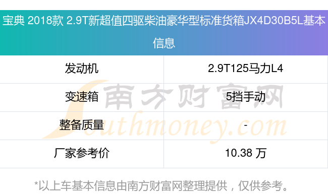寶典 2018款 2.9T新超值四驅(qū)柴油豪華型標(biāo)準(zhǔn)貨箱JX4D30B5L動力上搭載的是一臺2.9T125馬力L4渦輪增壓發(fā)動機(jī),匹配5擋手動擋變速箱,燃料形式為柴油,廠家參考價10.38萬元。