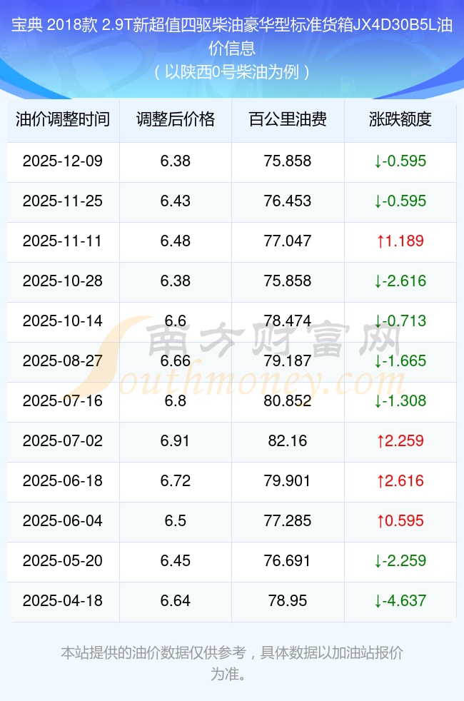按12月9日0號柴油最新調(diào)整價格6.38元每升來計算(以陜西為例),該車型百公里平均油費為75.858元,按上一輪11月25日調(diào)整價格6.43元每升來計算,百公里平均油費為76.453元,對比上一輪少花0.595元,下一輪油價調(diào)整時間為12月22日24時。