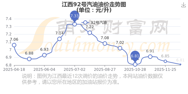 12月13日,江西92號汽油的價格是6.81元每升,本次的調(diào)整時間為12月9日,對比上次的調(diào)整減了0.04元,減0.584%,12月22日24時為下一輪油價調(diào)整時間,還有9.08天。